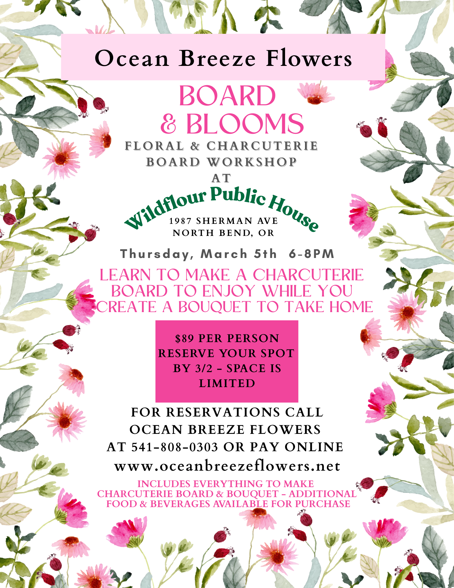 Board & Blooms Floral & Charcuterie Board Workshop hosted by Ocean Breeze Flowers at Wildflour Public House on Thursday, March 5th, 2026 from 6:00-8:00pm. This workshop will be at Wildflour where you will learn how to make your own charcuterie board to enjoy while you make a floral arrangement to take home. Location is at 1987 Sherman Avenue in North Bend. All charcuterie ingredients, floral supplies, flowers and instructions are included. Additional food and beverages are available for purchase. Reserve your spot by March 2nd - space is limited. $89.00 per person. Purchase ticket online with this link, call Julie at 541-808-0303 or stop in Ocean Breeze Flowers at 1866 Sherman Avenue in North Bend. Please note: refunds not allowed unless cancelled 8 days prior to event as space is reserved for you. -