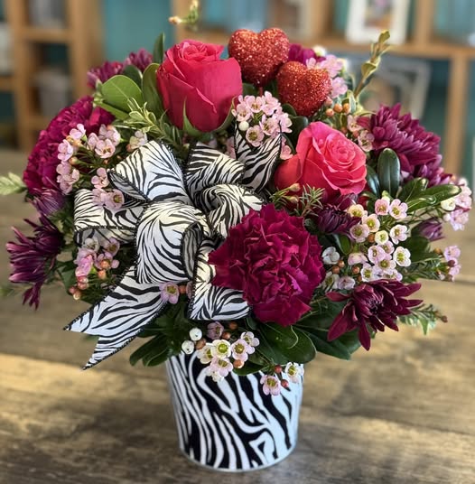 A "wild" vase and bow with a collection of hot pink blooms. Perfect for the fashionista in your life or to show your wild love! -